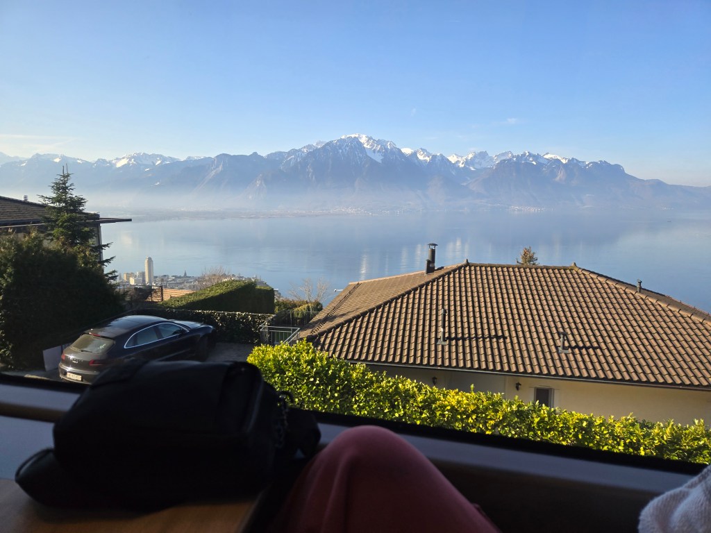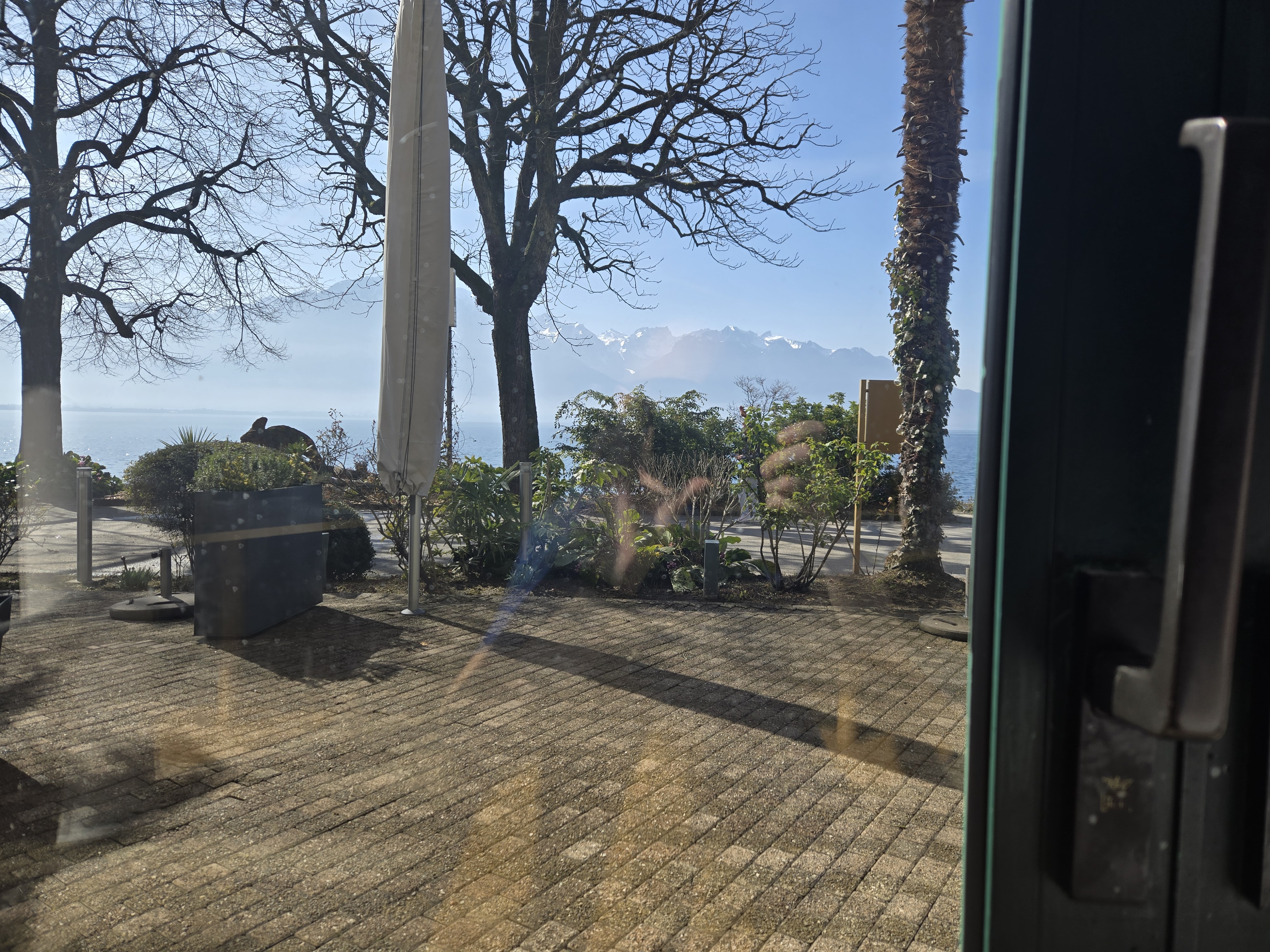 My boyfriend, Justin, and I landed in Zurich early in the morning, changed into our day outfits, and caught the next train south. The bathroom in the car we chose was broken, the next one was, too, but someone had broken into the next one so it was okay. We arrived in Montreux in the early afternoon. Traveling in the shoulder season is great because our hotel room was already ready for us to check into. We were very hungry by this point, so we just settled for the fancy cafe in the hotel. The food was really good, and we had a great seat by the window to see the lake. I had Foie Gras, and Justin had some mushroom stuff pasta.
