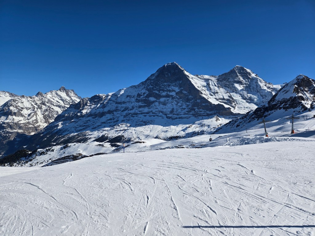 We got off the train in Wengen and took the gondola up to Mannlichen. There were loads of skiers all around, but it was fun to just walk around them clomping all slowly. We admired the famous side of Eiger and had a snack before continuing our journey back to town.